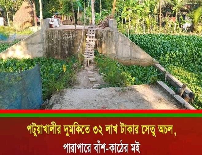 দুমকি উপজেলায়, বএিশ লাখ টাকার সেতুতে উঠতে হয় বাঁশ-কাঠের মই বেয়ে।